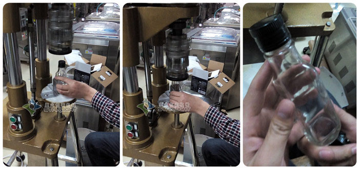 星火陜西旋蓋機(jī)所提供的這款酒瓶半自動旋蓋機(jī)屬于半自動操作設(shè)備之一,因此在實現(xiàn)玻璃瓶金屬管旋蓋之時,需要人工配蓋和人工進(jìn)出瓶的;上圖就是星火陜西旋蓋機(jī)提供的酒瓶半自動旋蓋機(jī)實現(xiàn)旋蓋工作的一個簡易過程,左邊的圖是人工把已經(jīng)蓋上蓋子的瓶子放在旋蓋頭下的托板卡位處,中間的圖則是旋蓋頭高速旋轉(zhuǎn)擰緊瓶蓋,右邊的圖則是旋蓋機(jī)旋蓋完成的效果。