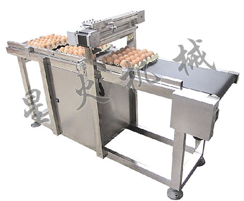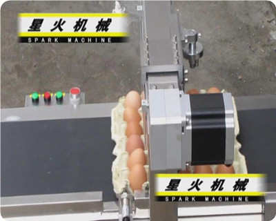 人工將雞蛋整托放至輸送帶上,便于噴碼機將需要噴印的生產(chǎn)日期、批號等字符自動噴印在雞蛋的端部,噴碼完成后,人工將整托雞蛋拿下。